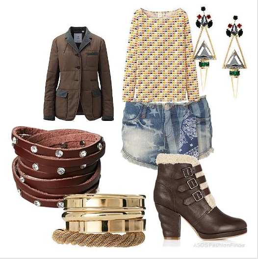 Denim shorts plus metal and studded bracelets worn with a patterned top and a preppy hunter style jacket along with cool leather boots. – this leads to a cool, casual, country but chic outfit.