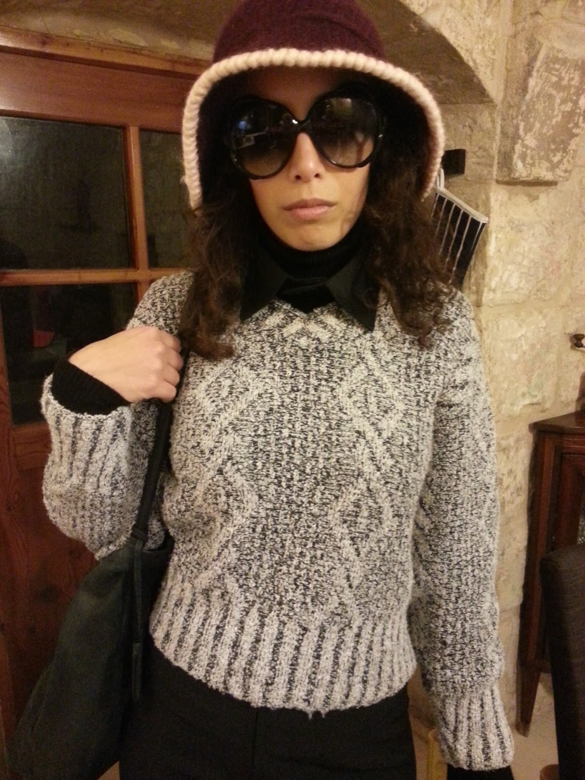 I wore it last Saturday, for an afternoon out shopping at Trop Mode clearance sale and decided to pair it with a grey vintage jersey sweater, a black turtle neck (worn under the sweater) a pointed black collar and a black skirt. I also added a black furla bag and a pair of black shades.