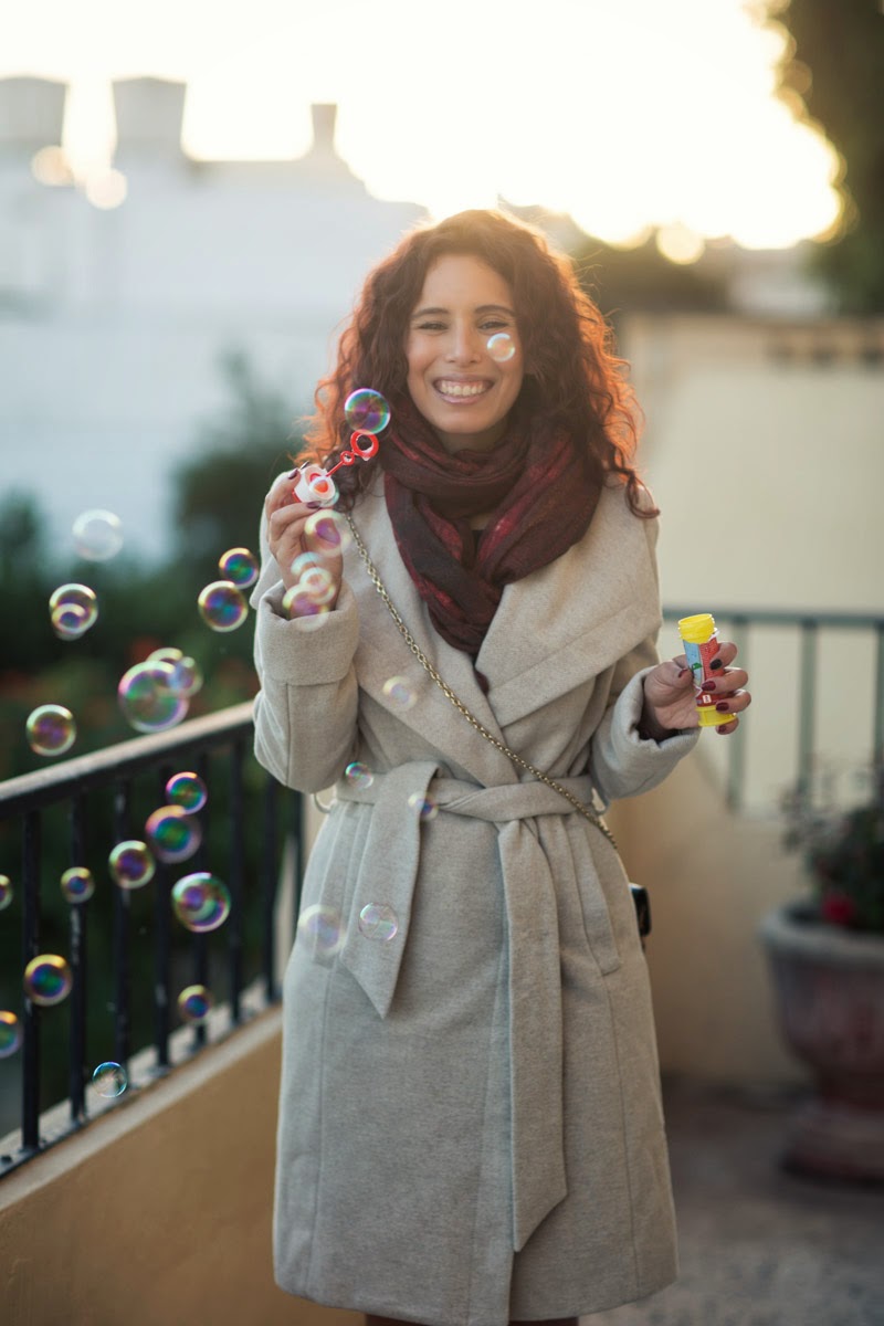 If you’re a regular reader of this blog you may have got a slight inkling that I’m a child at heart. I do believe that inkling may be correct because when I was in a sweet shop (Camilleri in Valletta and I almost bought EVERYTHING) and saw this bubble making device, I couldn’t resist. Plus I think the colours of the bubbles blend in perfectly with my beige coat and patterned scarf from MEXX…